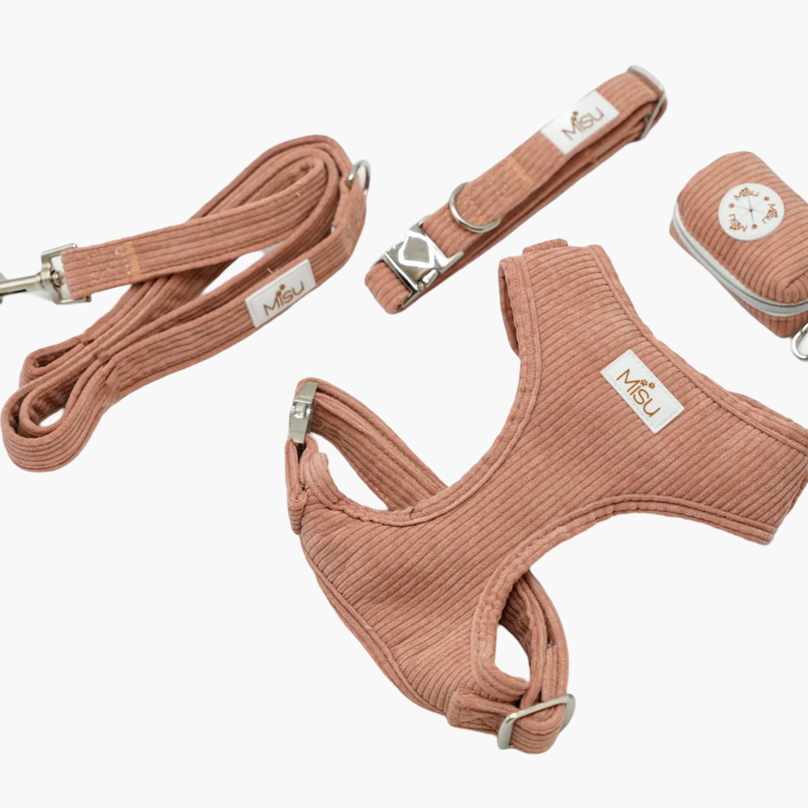 סט קורדרוי מלא המורכב מ-4 חלקים: קולר, רתמה, רצועה ותיק לשקיות/חטיפים.