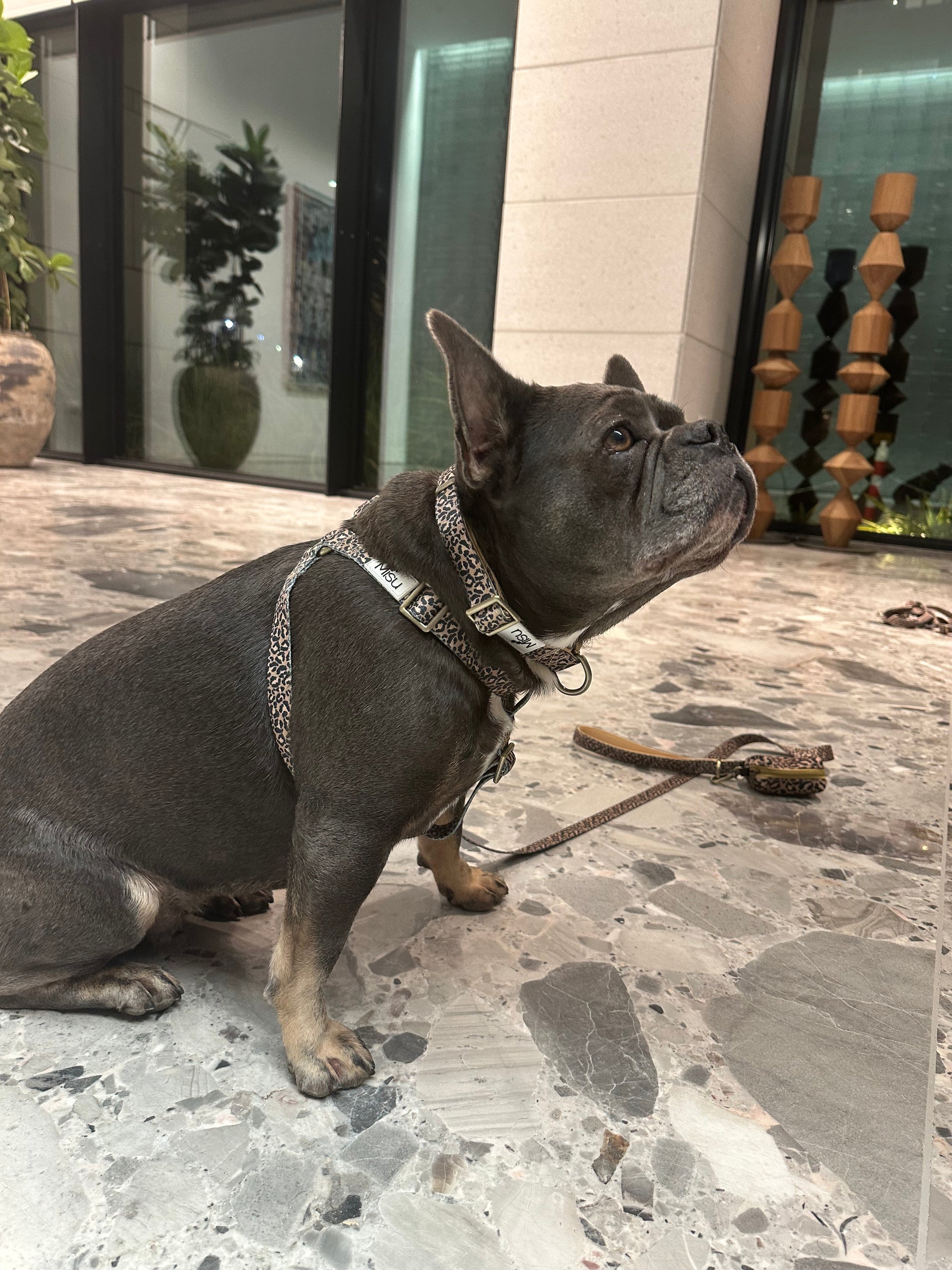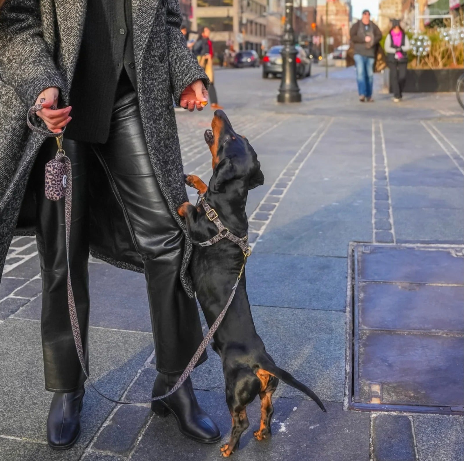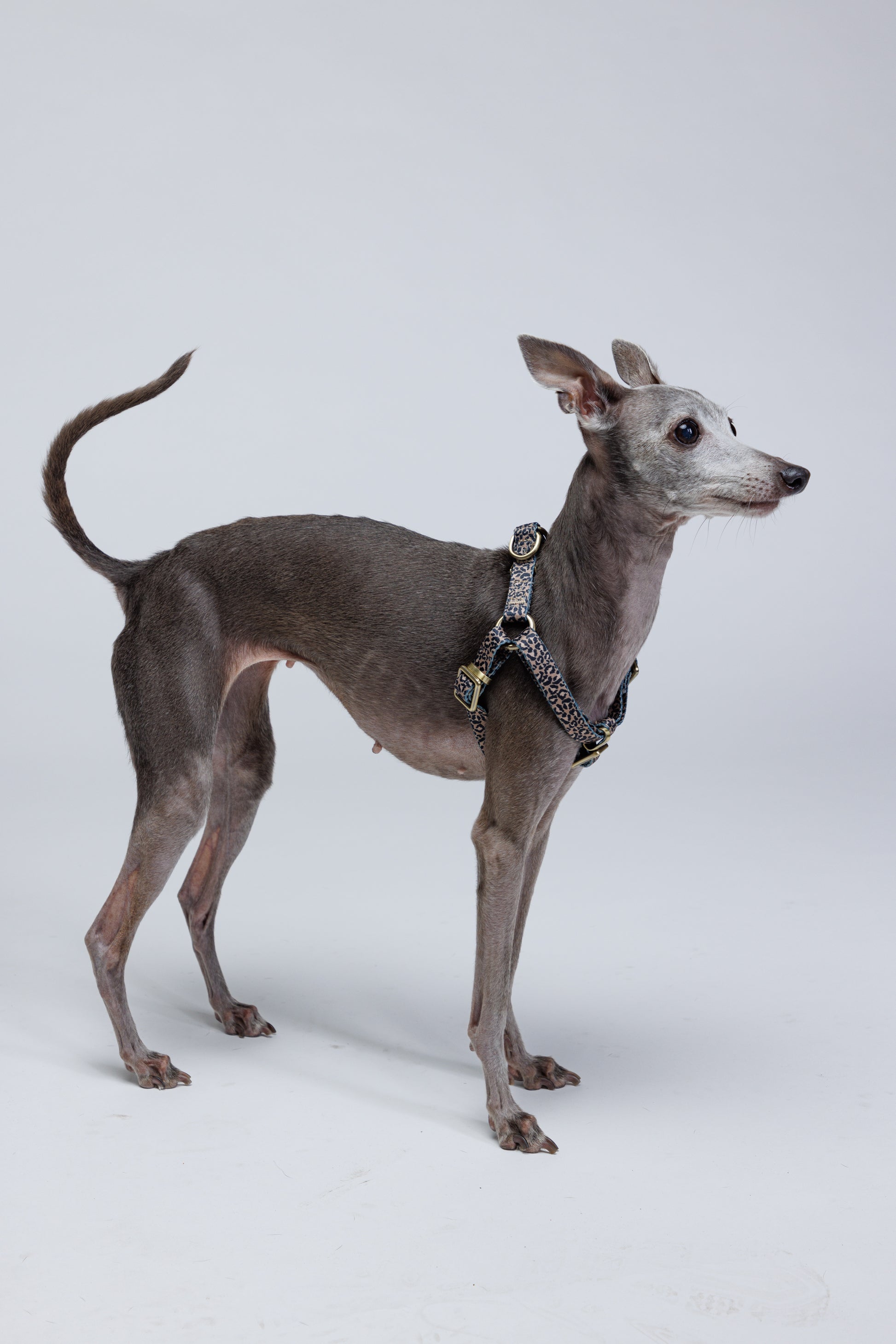 רתמה מתכווננת בדגם מנומר, עשויה מבד איכותי ונעים למגע, עם אבזם בצבע זהב מוברש למראה יוקרתי ומעודן. עוצבה במיוחד להעניק לכלבך נוחות מרבית וסטייל.